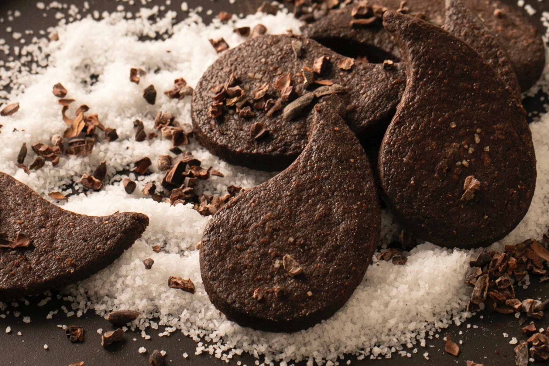 カカオ香るほろ苦いザクザク塩カカオサブレです。田野屋紫蘭のお塩はマイルドなものを使用し、少しアクセントで表面にもふって焼き上げました。